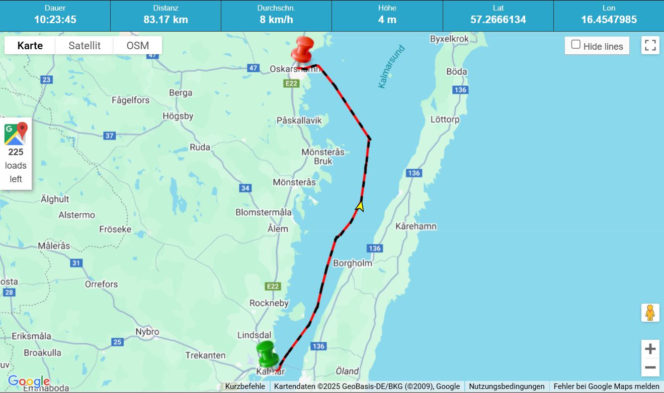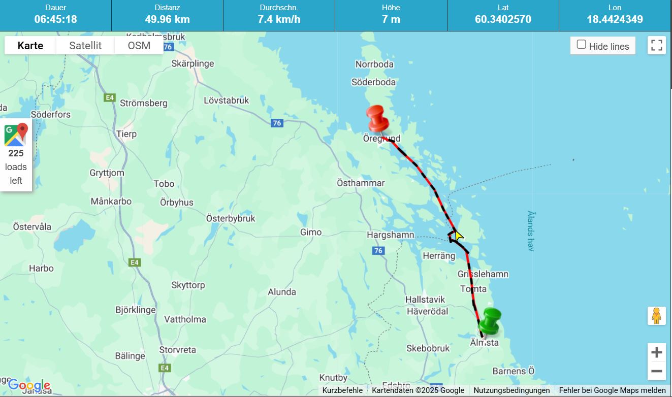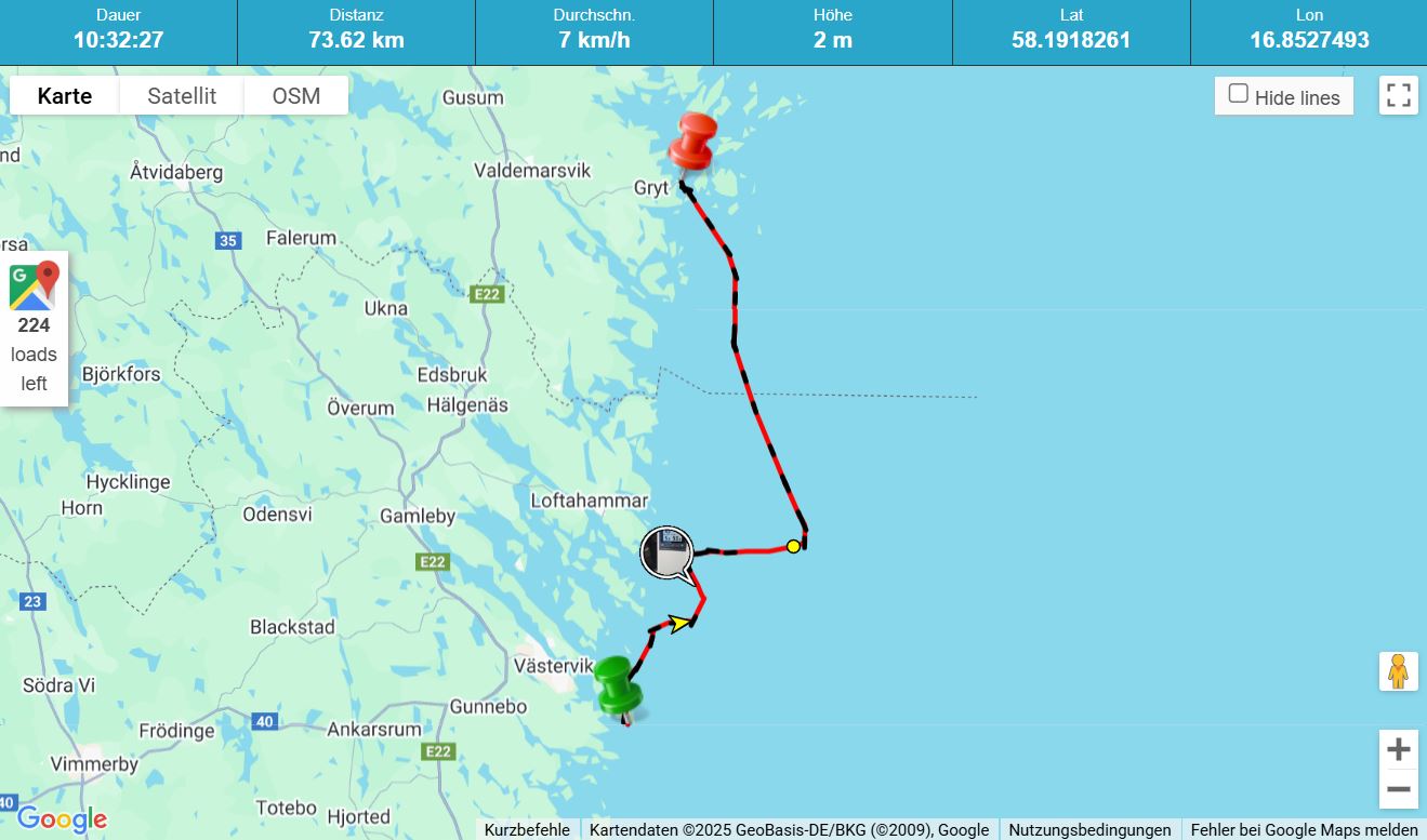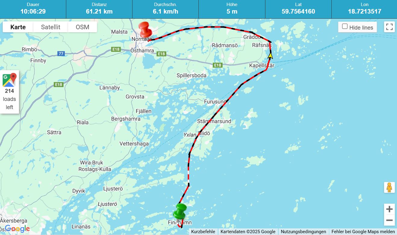 In plus/minus 10 Tagen habe ich meinen Umkehrpunkt erreicht. Dann muss ich Kurs Richtung Süden nehmen, damit ich mein Winterlager in Gävle erreiche (das jetzt sicher und alles geklärt ist). Und sollte mein Umkehrpunkt mein heutiger Liegeplatz sein, ist das auch o.k.